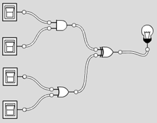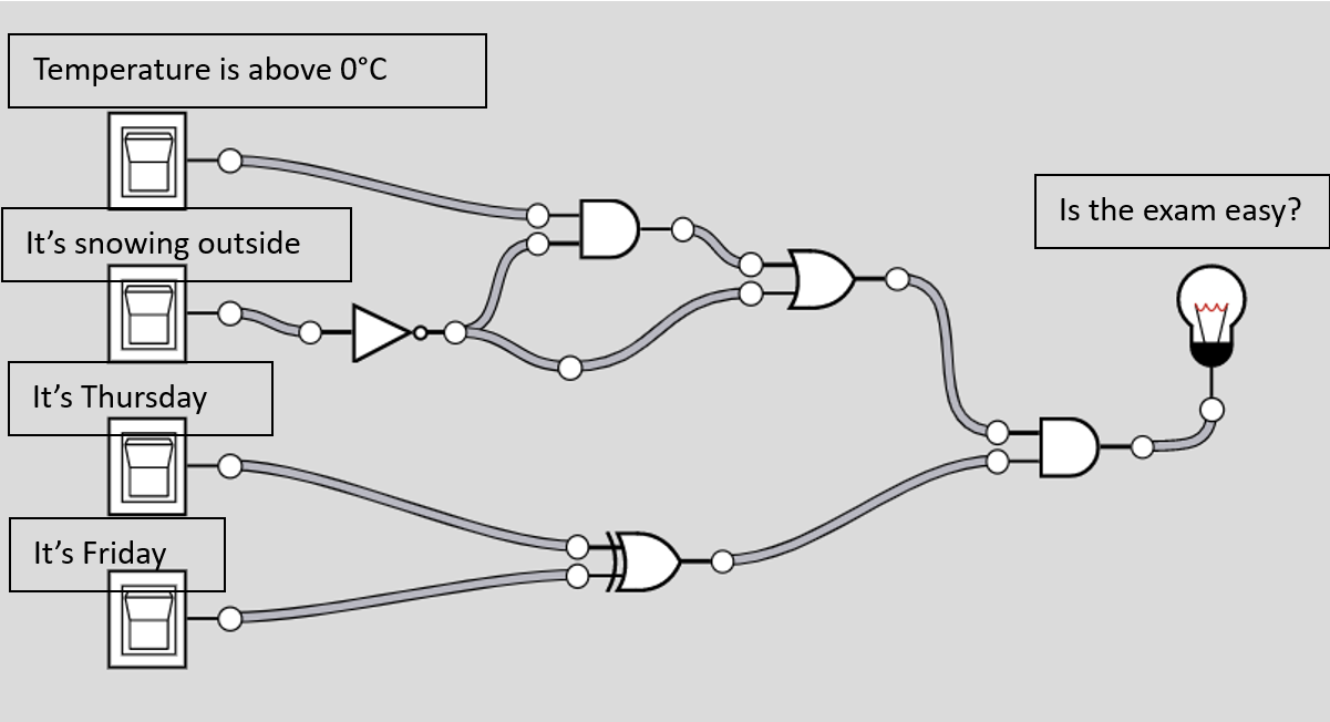 They have four switches that can turn on/off independently. The first switch represents if the weather is above 0 degrees Celsius in Canada. The second switch represents if it’s snowing outside (negative temperatures). The third switch represents if the exam is happening on a Thursday and the last switch represents if the exam is happening on a Friday.