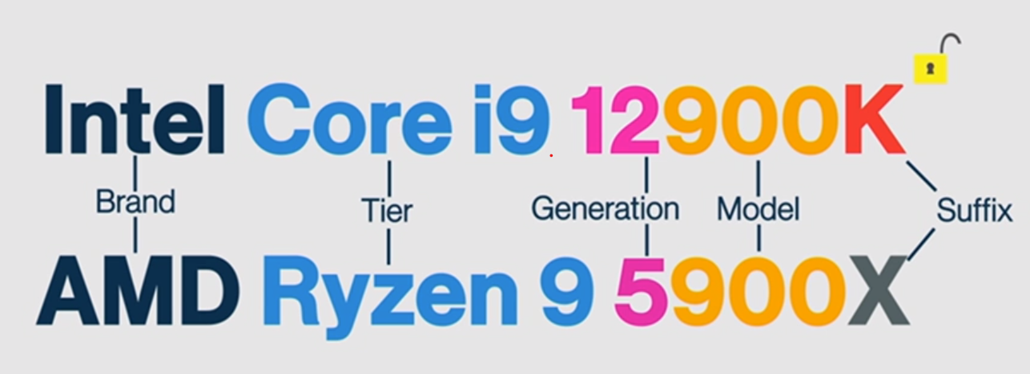 - Sufix: Is an added letter which depending on the manufacturer could refer to different properties of the CPU. For example, intel uses “K” to indicate that the CPU is unlocked and can be overclocked. AMD uses X to indicate that this CPU is already slightly overclocked.