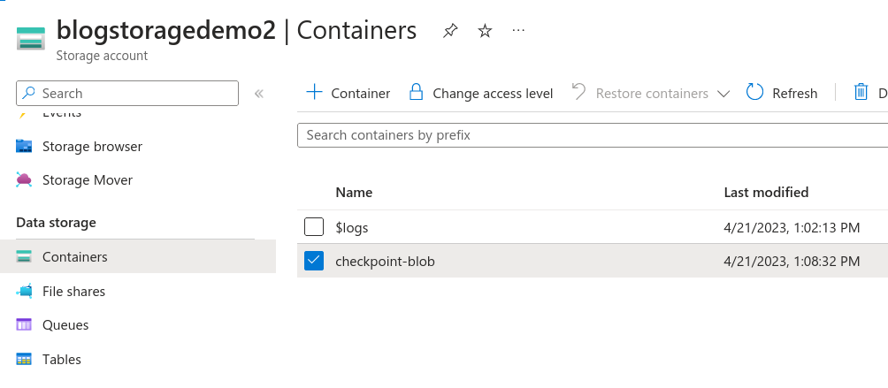 Here we have checkpoint-blob as the name of the container.#