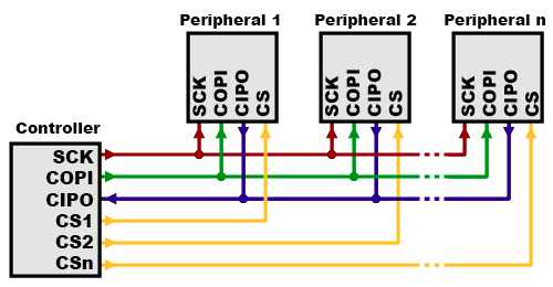 Each peripheral device connected to the controller will need a separate CS line. To talk to a particular peripheral, the controller makes that peripheral’s CS line low and keep the rest of them high.